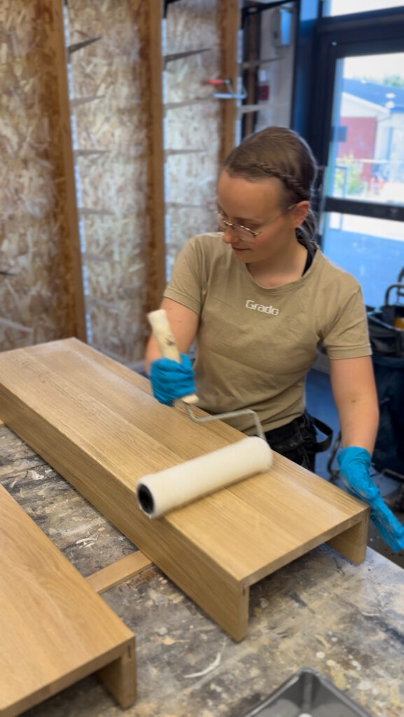 Anniina Väkeväinen työskentelee meillä pintakäsittelyn parissa ja antaa sisäportaille niiden viimeisen silauksen ennen portaiden asentamista paikoilleen. Hän näkee työssään päivittäin, miten suuri merkitys pinnan sävyllä ja laadulla on portaikon kokonaisilmeeseen.