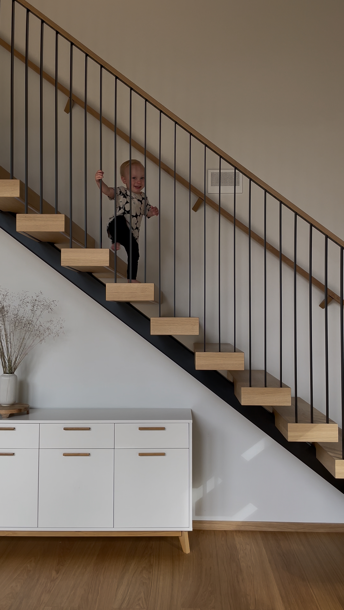 Suunnittelussa korostui ulkonäön lisäksi myös niiden turvallisuus ja toimivuus arjessa. ”Käytämme portaita päivittäin paljon, ja niiden turvallisuus on tärkeää. Valitsimme mallin, jossa on liukuesteurat, mikä oli erinomainen ratkaisu, sillä liikumme usein villasukat jalassa. Portaat tuntuvat tukevilta ja laadukkailta,” Elsa kehuu.