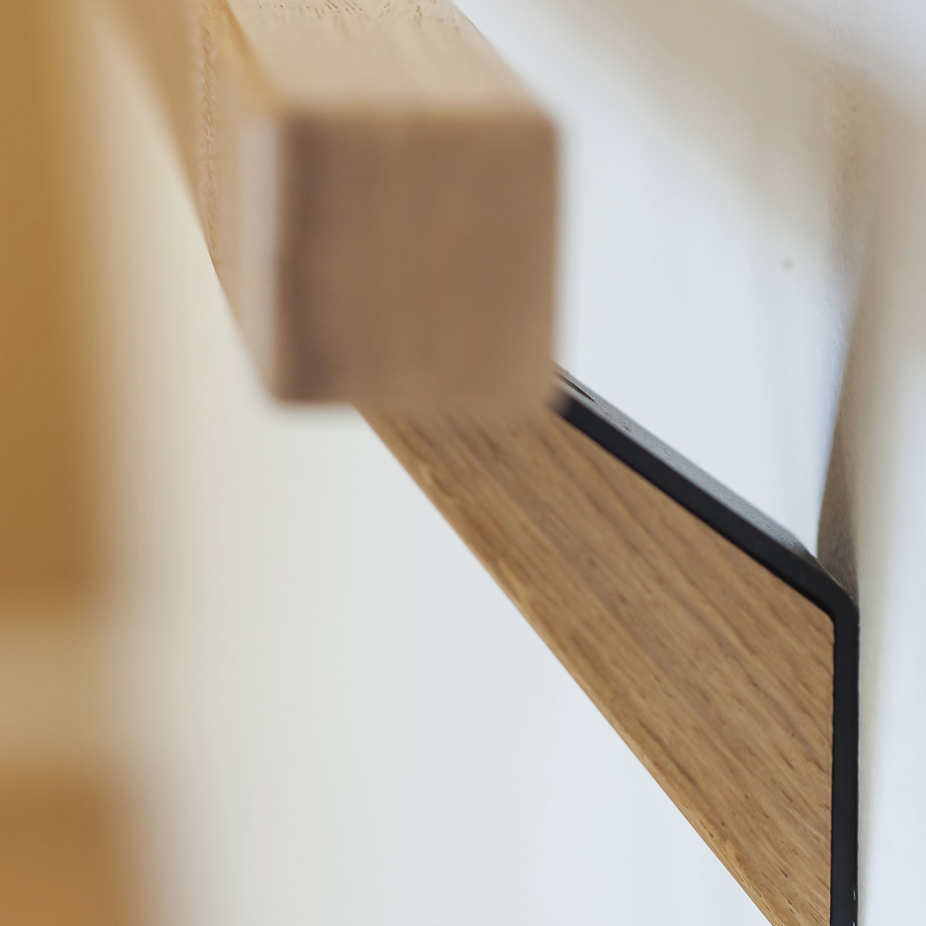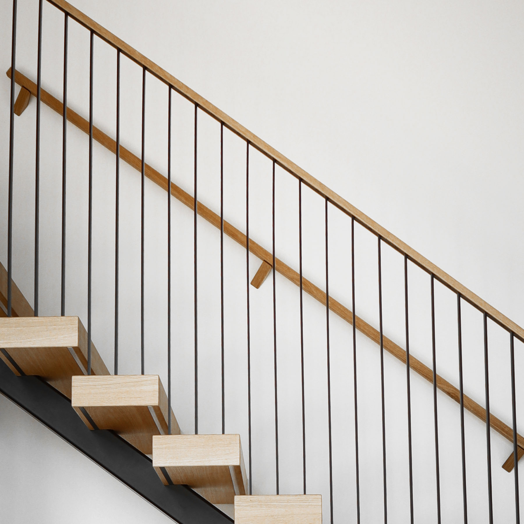 Tämä viisto linja toistuu kannakkeen muodossa – eleettömänä ja tarkkana. Viisto luo portaikkoon rytmin, joka sulautuu osaksi arkkitehtuuria.